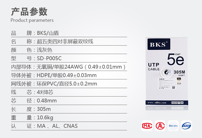 ●超过Cat5E类标准●高性能的高速电缆,支持带宽250MHz ●可以支持千兆以太网应用●ISO/IEC 11801,TIA/EIA 568B的超五类标准●符合的CMR阻燃级别●低烟无卤产品符合相关阻燃(IEC332/3)、低烟( IEC1034 ).无卤(IEC754)标准提供20年质量保证。